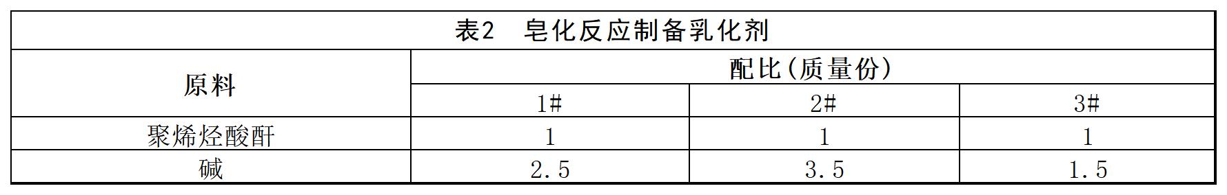 (2)皂化反应制备乳化剂:在反应容器中加入反应物聚烯烃基羧酸或酸酐与碱摩尔比为1:(1~5)。碱是氢氧化钠、氢氧化钾、氢氧化钙、氢氧化镁、氢氧化钡。最好选用氢氧化钠、氢氧化钾,聚烯烃基羧酸或酸酐与碱摩尔比最好为1:(2.1~2.5)。反应时间是5~60min,皂化温度50~100℃。