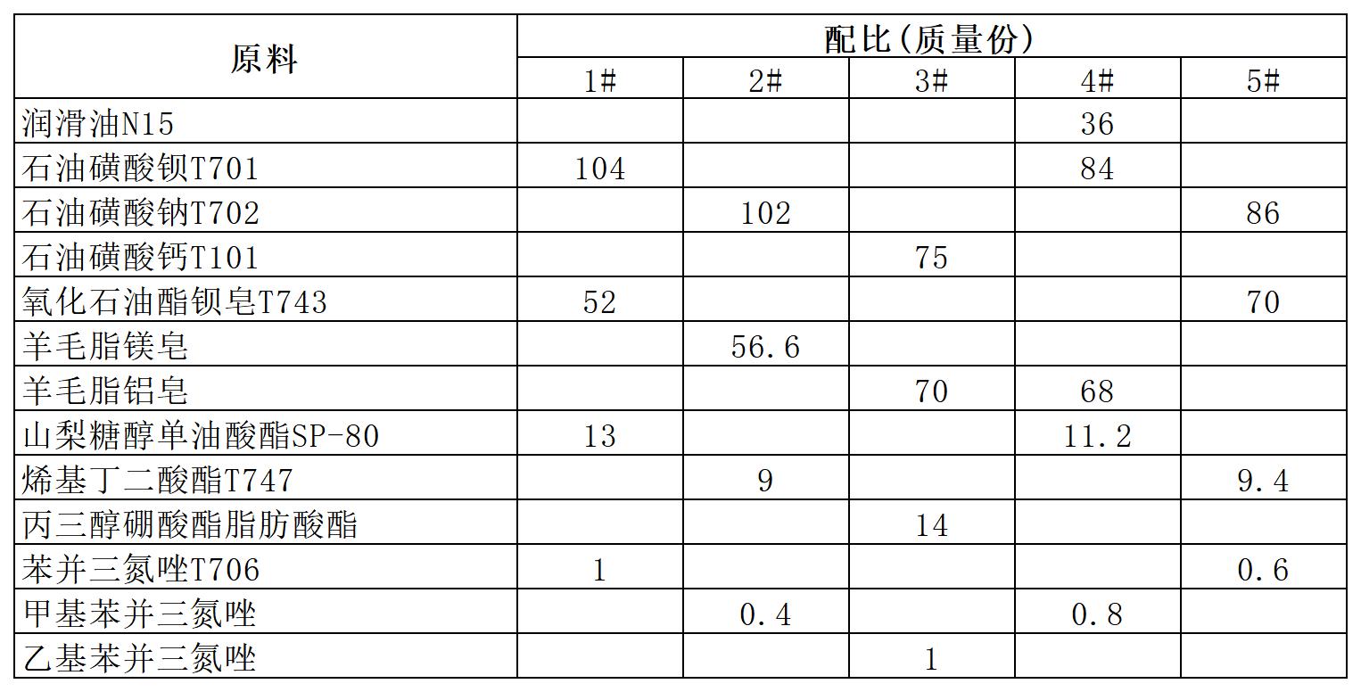 将基础油加入釜内,升温至80~110℃,再加入石油磺酸盐、高 分子羧酸及皂类,待其溶解后,加入酯类、苯并三氮唑及衍生物,搅拌2~3h, 过滤后,即为防锈油,取2%~17%,用120#溶剂油稀释至100%,即可使用。