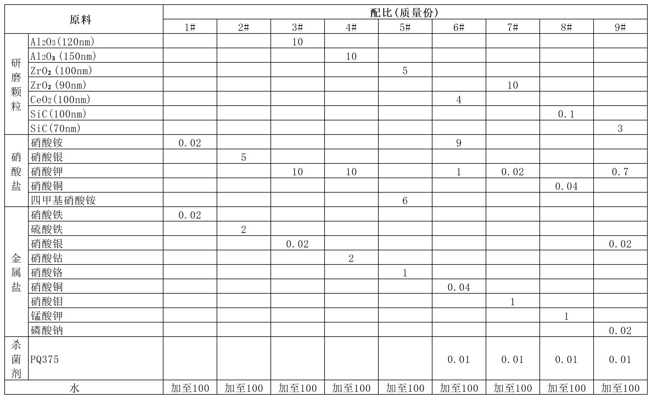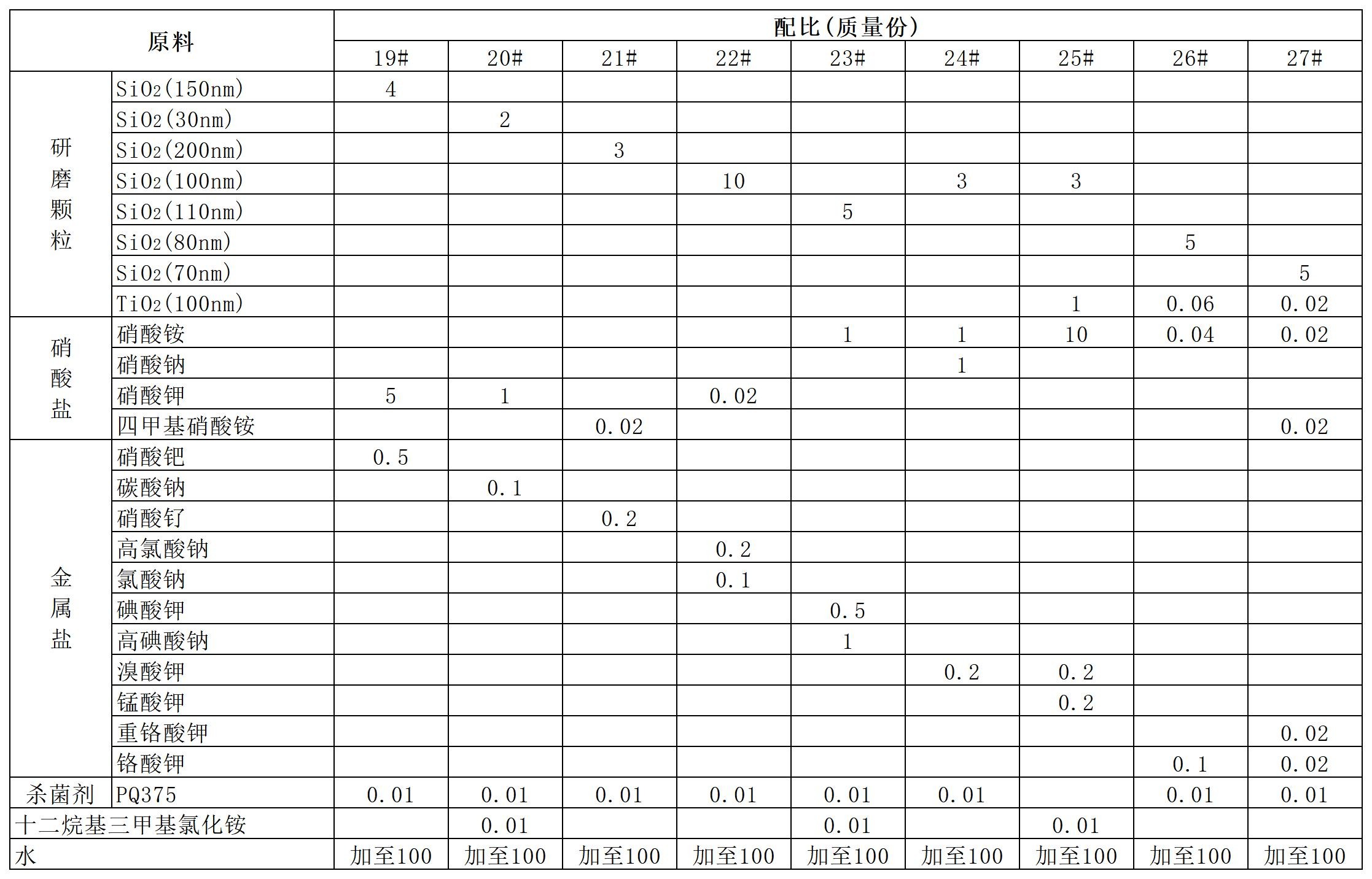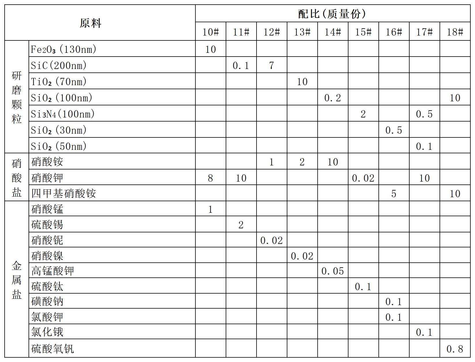 将各组分简单混合均匀,采用氢氧化钾、氨水和硝酸调节至所需的 pH值,即可得到抛光液。