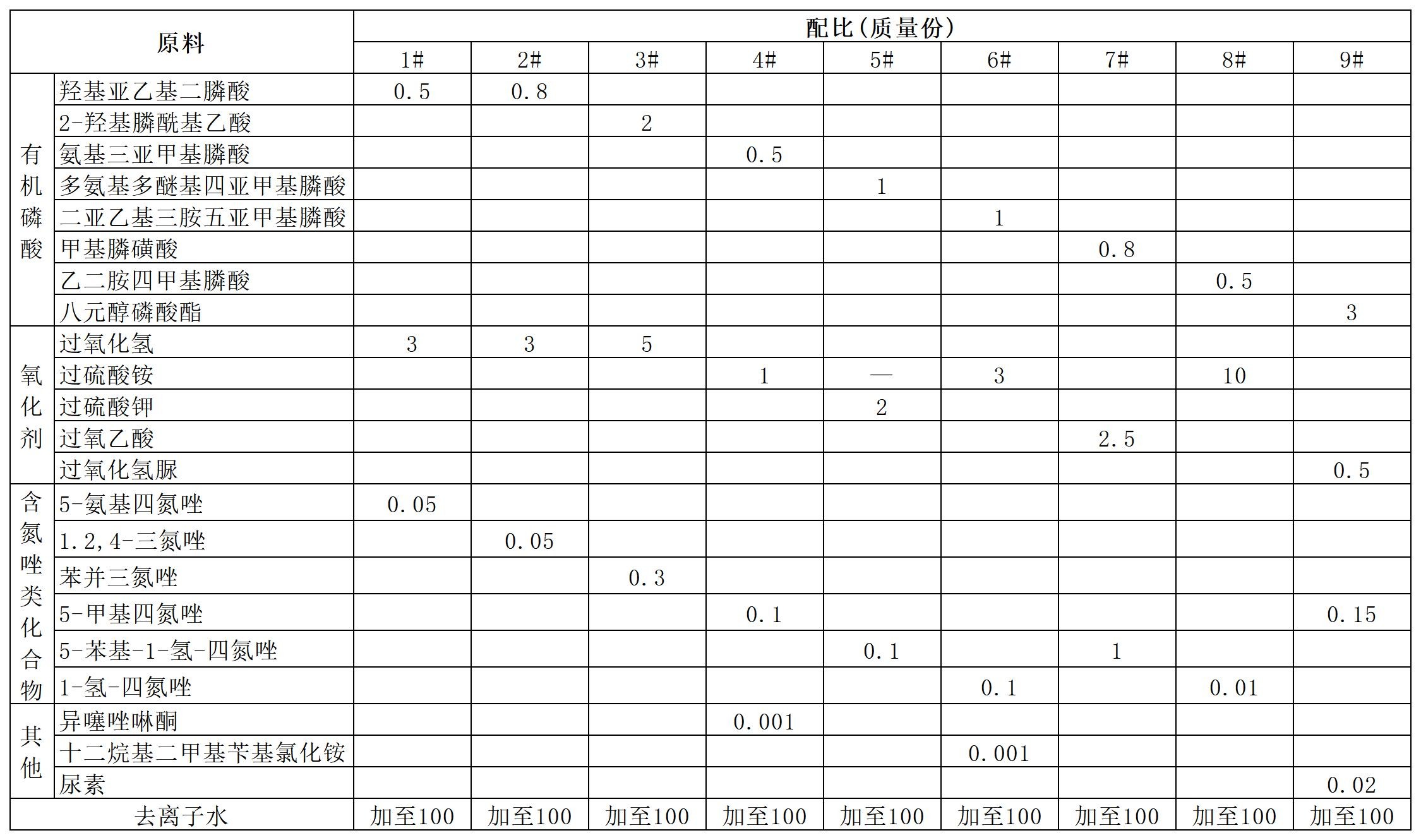 所述的氧化剂可为现有技术中的各种氧化剂,较佳的为过氧化氢、过硫酸铵、过就酸钾、过氧乙酸方现有技术甲的的一种或多种,更佳的为过氧化氢。
