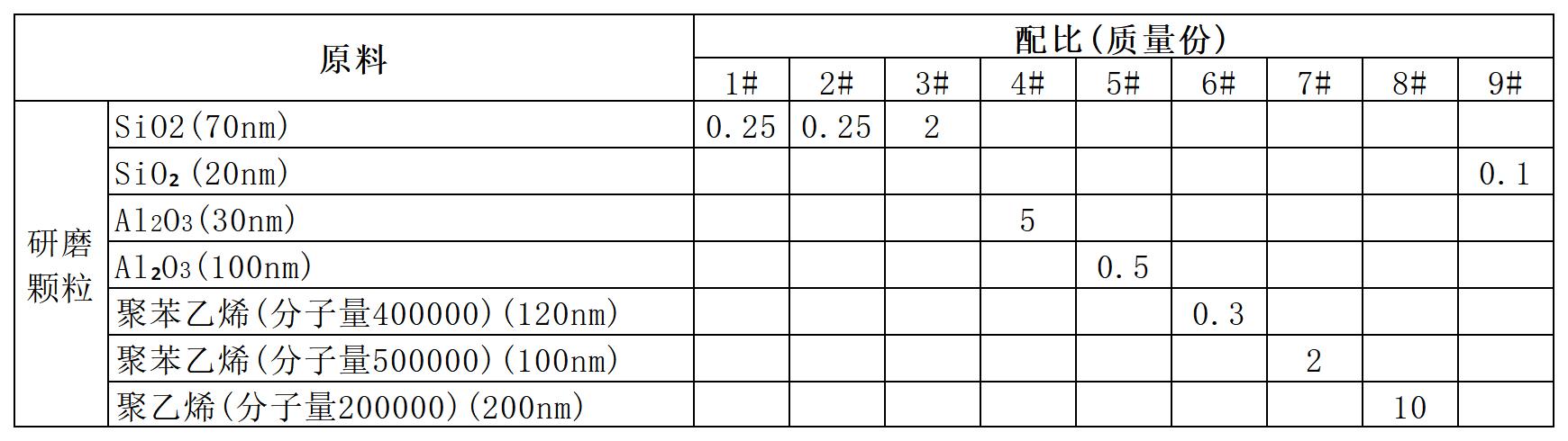 所述的研磨颗粒可选自本领域常用研磨颗粒,优选二氧化硅、氧化铝、和聚合物颗粒(如聚苯乙烯或聚乙烯)中的一种或多种,更优选二氧化硅。所述的研磨颗粒的粒径较佳的为20~200nm,更佳的为30~100nm。