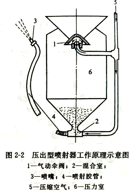 使砂粒或钢丸产生喷射作用,是通过喷射器实现的。喷射器有吸入型和压出型两种,这两种型式喷射器的工作原理如图2-1和图2-2所示。