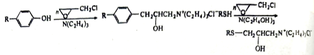 1951,年外美国的John F Oun利用环氧氯丙烷与烧基酚和三乙胺反应,合成了含羟丙烯基的季铵盐型阳离子表面活性剂。该产物是一种优良的分散剂,其表面活性剂优异。利用环氧氯最丙烷与硫醇,三乙醇胺反应得到的含羟丙烯基的季胺盐型阳离子活性剂可用作洗净剂、湿润剂、乳化剂和杀菌剂。反应式如下: