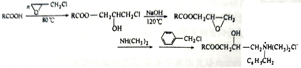 1966年,美国的Tonce E.Milks以羧酸、环氧氯丙烷、二甲胺、苄氯为原料,合成了含羟丙烯基的季铵盐型阳离子表面活性剂。该产物具有优异的抗菌性能。反应式如下:
