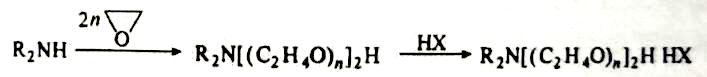 1969年,法国的Reck.Richard A.合成了含两个聚氧乙烯基链的季铵盐型阳离子表面活性剂。该产品对纺织品具有很好的柔软调理性。反应式如下: