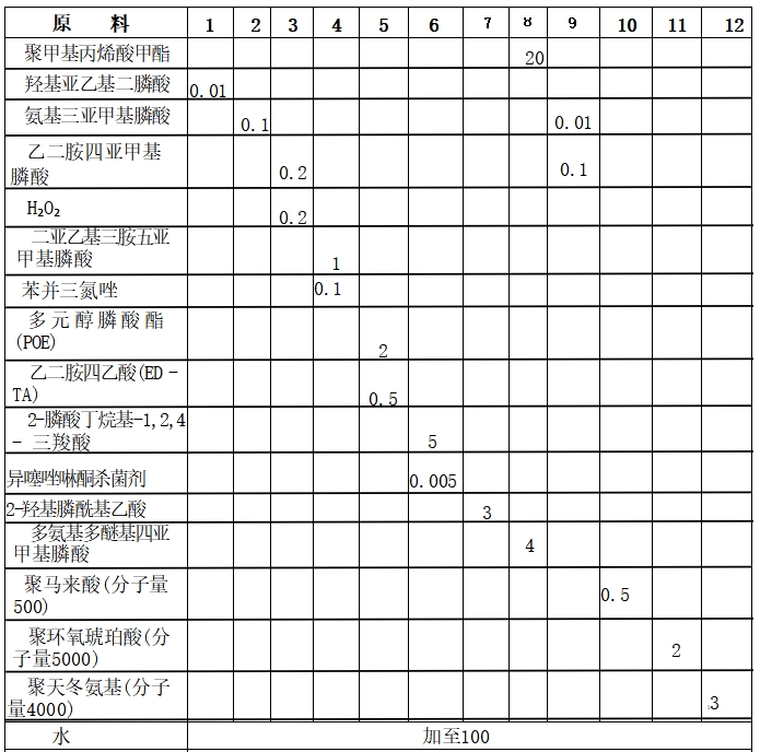 本品各组分质量份配比范围为:研磨颗粒0.1~20、有机膦酸0.01~5、聚羧酸类化合物0.01~5、低级脂肪醇0.1~20、糖类化合物0.01~15、水加至100。