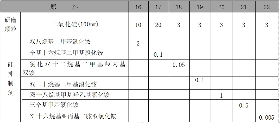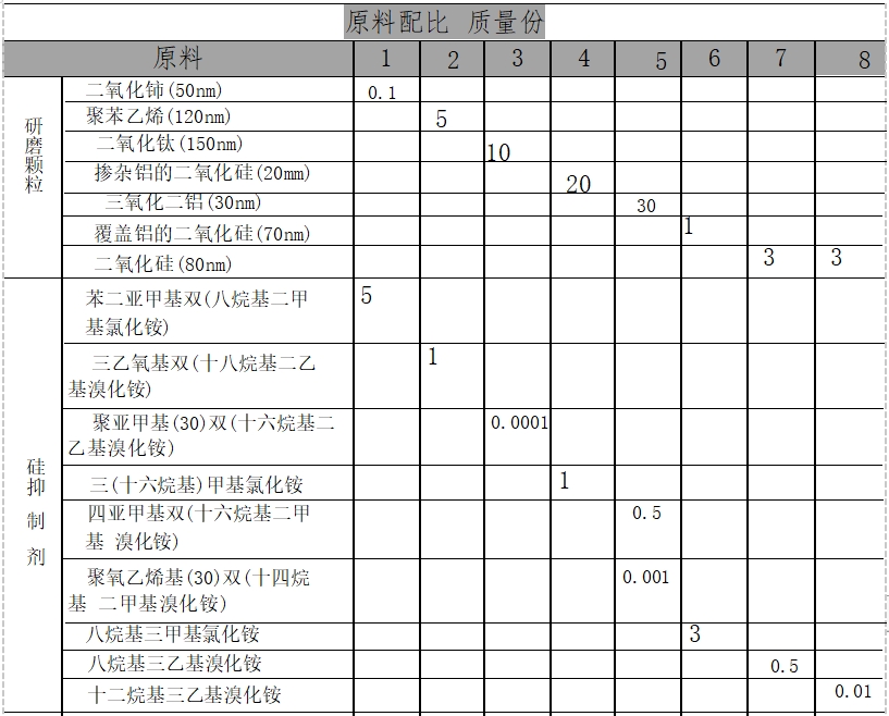 本品各组分质量份配比范围为:研磨颗粒0.1~30、硅抑原料配伍制剂0.0001~5、硅增速剂0.0001~10、水加至100。
