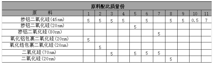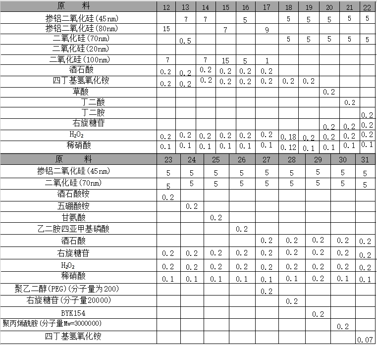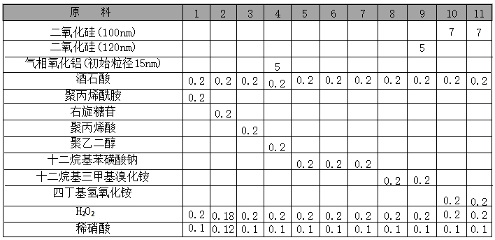 原料配伍 本品各组分质量份配比范围为:掺铝二氧化硅磨料0.5~15、第二种磨料0.5~15、阻蚀剂0.1~0.3、氧化剂0.2~0.4、速率增助 剂0.1~0.3、表面活性剂0.07~0.2、pH调节剂0.1~0.12。