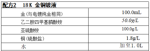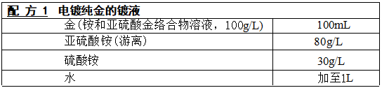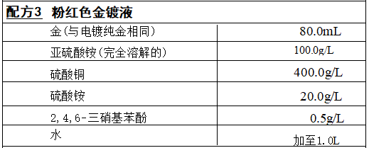 工艺条件:pH值7,温度55℃,电流密度0.6A/dm², 能镀得坚硬的、可 延展的、约18K红色的金镀层,得量为52~55mg/(A·min)。