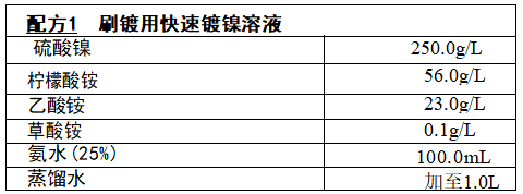 快速镀镍溶液配制:将硫酸镍加入容器中,加蒸馏水至配制体积的2/5, 搅拌使其溶解,在另一容器加柠檬酸铵、乙酸铵、草酸铵,加蒸馏水为配制体 积的1/5,搅拌使全部溶解后,加人硫酸镍溶液内搅匀后加氢水,调pH 值为 7.5左右,加蒸馏水稀释至所需体积。