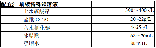 特殊镍溶液为深绿色,是一种强酸性镀液。主要用于不锈钢、铬、镍、合 金钢等难熔金属以及铝、铜等基材的预镀层,由于酸性较强,不宜在铸铁等 质地疏松的基材上使用。镀层厚度一般控制在1~2 μm。为了获得较好的 结合强度,通常对在酸性活化液活化后的零件,不需进行水洗,先在无电流 的状态下,用特殊镍溶液擦拭3~5s,再接通电源进行刷镀。本镀液具有结晶细密、孔隙率少和良好的防腐蚀能力。