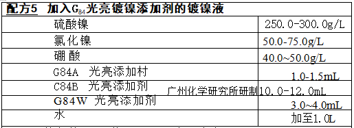 本配方具有快出光、高整平、光亮范围宽、使用电流范围广、镀层应力低 和防腐蚀性能好等特点,比使用丁炔二醇、糖精的配方优越。由广州化学研兖所开发。