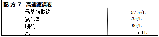 目前用于生产的高速镀镍体系,主要是氨基磺酸镍体系,其特点是内 应力小和孔隙率低。镀前,先镀一层防扩散隔离镍层,其厚度大致在 2.5-7.5μm 范围内。为了维持高的电流密度而不致将镀层烧坏,镀液的 流速大于1m/s 或用高速喷射装置,电流密度保持在60~100A/dm²,沉积 速度为12~20μm/min 。高速电镀镍在生产上主要用于镍管和镍板,如铸镍的发动机喷管和化工、制糖用的电铸镍筛网等。