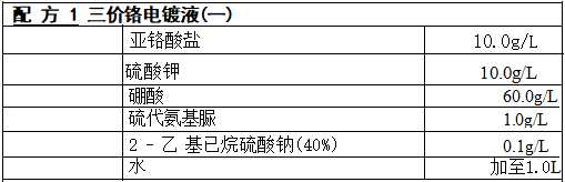 工艺条件:pH值3.2,温度50℃,阳极采用镀铂钛板。在 电 流 5A、时 间 3min内可在霍尔槽试片上沉积出均匀、全光亮的铬镀 层 。