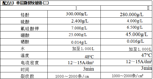 单层微裂纹镀铬工艺大多采用混合型镀液,其中可以少含或不含硒化 合物。有的镀液含有硼酸,用以克服较高浓度的硒化合物所引起的镀层呈 微蓝色雾状的问题。