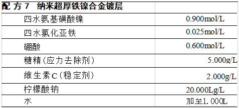本配方可制得具有纳米结品结构的超厚铁镍合金镀层,它具有良好的耐蚀性。可用于防护、装饰、电铸、尺寸修复等