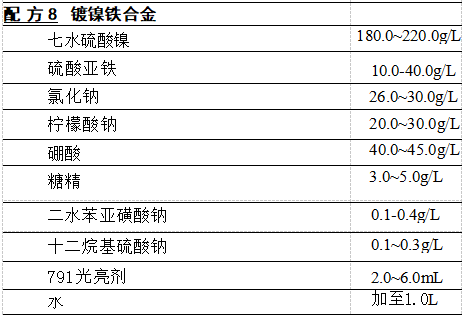 工艺条件:H 值3.2~3.8,温度60~65℃,电流密度3~5A/dm²,阳 极 面积(Ni:Fe) 为8:1~12:1,挂镀。
