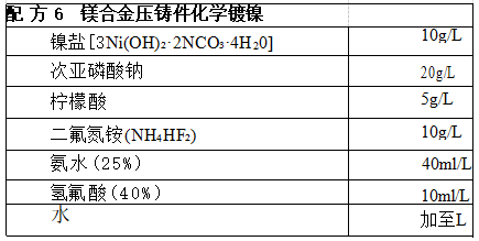 工艺流程:压铸件除油 → 浸蚀(Cr0360g/L,HNO390mL/L, 室温,20~ 60min)→ 活化(70%HF50~55ml/L,室温,活化5-10min)→化学镀镍。 镁合金压铸件经化学镀镍具有较好的抗腐蚀能力、热稳定性和可焊接性,用于汽车轻型化的电动机、方向盘、变速箱等部件。