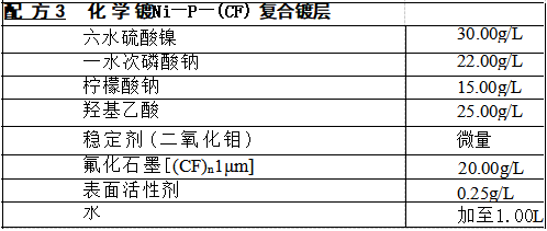 配制镀液:将氟化石墨微粒与适量表面活性剂一起湿润,放入镀液中, 搅 拌 1 ~ 2h, 调 pH=5.0, 并使微粒均匀分散在镀液中。将镀液置入水浴中 加热,改用间歇搅拌,当温度达到90℃后,放入处理好的物件,进行施镀。