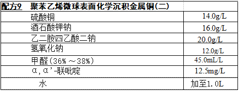聚苯乙烯微球(粒径可在数纳米至毫米)先经前处理:敏化(采用氯化 亚锡、盐酸溶液),活化(采用硝酸银、氨水溶液),还原(采用甲醛溶液)。处 理后放入pH=12.5 、温度为室温的化学沉积液中,在搅拌状态下反应适当 时间,以保证微球表面沉积出所需厚度的金属铜。