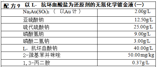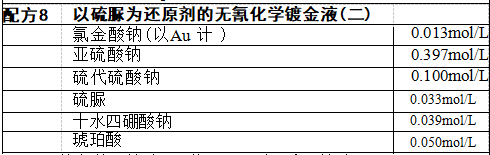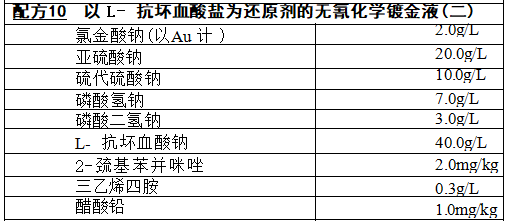 以上两镀液与传统的以硫脲为还原剂的碱性化学镀金液不同的是在镀 液中加入了羧酸类、氨基羧酸类等聚合抑制剂,旨在防止硫脲本身氧化成氨 基氰和聚合成氨基氰聚合物,从而避免因聚合物积聚在金属基材上产生无 镀层现象,获得均匀完整的镀金层,提高镀金层焊料湿润性及其与元器件的 焊接可靠性。特别适用于高密度印刷线路板的化学镀金。