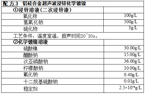 高硅铝合金作为电子器件的外壳材料,其表面必须镀耐蚀性强、可焊性 好、真空性能佳的化学镀镍层。而化学镀镍前在超声波场中进行浸锌处理, 不仅缩短浸锌时间,而且锌层均匀性及结合力都得到改善,从而提高化学镀 镍的合格率。硫化物的加入可在铝表面产生微量的硫化锌晶粒,在化学镀 镍时起催化作用;而硫化锌晶粒在酸性化学镀镍液中被逐渐溶解掉,不会夹 杂在镀层中。化学镀镍时采用二次化学镀镍法,可提高镀层质量。施镀前工件要预热至反应温度。
