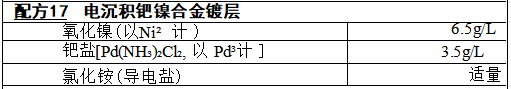 本镀液电沉积可得镍含量50%、硬度较大、孔隙率较小及耐蚀性较好, 且弯曲、热浸和入工汗试验都符合 ISO 3160/2—1992标准的镀层。钯镍合 金镀层作为金镀层代用品,被广泛应用于电子工业领域。