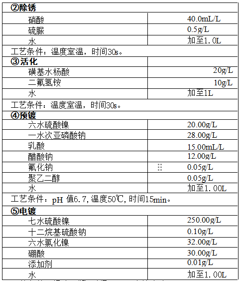 电镀工艺流程:高温烘烤除油(200℃,1h)→ 封孔(浸硬脂酸锌,135℃, 20~25min)→ 滚光 → 冷水洗 → 除油 → 热水洗(60~70℃) → 冷水洗 → 除 锈→冷水洗→ 活化→冷水洗→预镀→冷水洗→ 电镀→水洗→烘干。