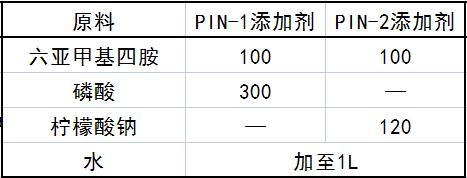 (1)活化处理液添加剂的制备。PIN-1添加剂的制备:将磷酸和六亚 甲基四胺溶于纯水中,得到PIN-1添加剂的2倍浓缩液;PIN-2添加剂的 制备:取六亚甲基四胺和柠檬酸钠,溶于纯水中,得到PIN-2添加剂的4 倍浓缩液。