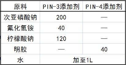 (3)中和处理液添加剂的制备。PIN-3添加剂的制备:取次亚磷酸钠、氟化氢铵、柠檬酸钠,溶于纯水中得到PIN—3添加剂的4倍浓缩液。PIN—4添加剂的制备:取明胶,置于50~60℃热水,搅拌至溶,煮沸,得到PIN-4添加剂的4倍浓缩液。