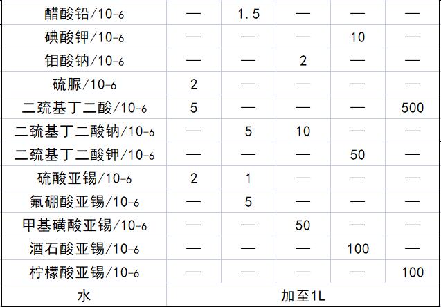 作为优选,二价锡离子以硫酸亚锡的形式存在,硫酸亚锡含量为2x10-6;以氯化亚锡和氟硼酸亚锡二种并存的形式存在,氯化亚锡含量为1x10-6,氟硼酸亚锡含量为5x10-6。