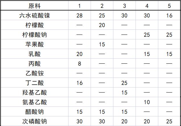 本品化学镀镍的方法:零件先进行相应的预处理。钢铁零件进行除锈、除油、稀酸活化处理;铝合金、镁合金零件进行除油、去氧化皮、沉锌等处理;铜及合金零件(包括BPC线路板)进行除油、酸洗、氯化钯溶液活化处理;塑料零件进行粗化、活化、解胶等处理;陶瓷经过粗化、活化、解胶等处理。将上述经过不同预处理的各种材质的零件,分别放入本品各实施例的镀液中施镀2min以上,取出水洗,封闭,烘干或吹干。