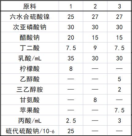 本品各组分配比范围为(g):六水合硫酸镍20~30、次亚磷酸钠20~30、醋酸钠15~20、丁二酸6~10、络合剂30~50、稳定剂20x10-6~60x10-6、电镀中间体30x10-6~100x10-6、水加至1L。 络合剂主要成分为有机一元酸、二元酸、氨基酸或醇酰胺,特别是柠檬酸、甘氨酸、乳酸、苹果酸、葡萄糖酸、丙酸、乙醇酸、三乙醇胺、酒石酸、EDTA、水杨酸等,可选其中的一种或几种复配组成,得到磷含量适中(6%~9%P)、孔隙率低,耐蚀性和耐磨性佳的镍沉积层。此类络合剂能够与镍离子有效络合,提高镍离子的稳定性,防止镀液析出沉淀,增加镀液稳定性。并且能够细化结晶,改善镍—磷沉积层的性能,抗蚀性好和耐磨度高。络合剂的复配还可显著提高溶液亚磷酸钠的容忍度,从而提高使用寿命。