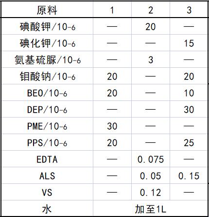 稳定剂主要成分为碘化钾、碘酸钾、铝酸盐、硫脲、氨基硫脲、硫代硫酸盐、亚锡离子、硫氰酸胺、马来酸等,可选用其中的一种或几种组成。稳定剂的选用可以提高溶液的稳定性,防止局部过热、pH过高或某些杂质影响造成的溶液分解现象,使施镀过程在控制下有序进行。它们的最佳含量为20x10-6~40x10-6。