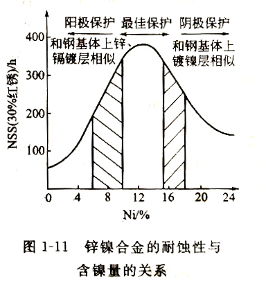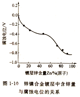 锌是两性金属,能与酸和碱作用。锌的标准电极电位是-0.76V,比铁负,对钢铁基体来说,起电化学保护作用,是阳极性镀层。镍的标准电极电位是—0.25V,比铁正,因而对钢铁不能起阳极保护作用。锌镍合金镀层的电极电位随镀层中锌含量的变化而改变,如图1-10所示。