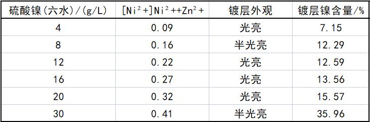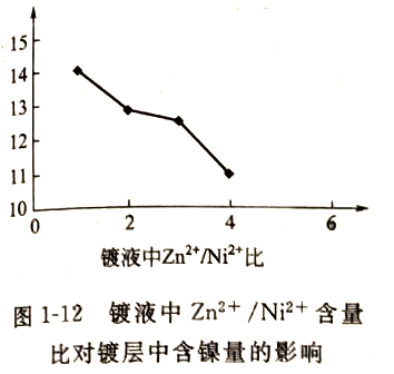 ①主盐的作用 氧化锌和镍盐是镀液中的金属离子来源,锌离子的来源还可采用氯化锌和硫酸锌等盐类。由于氧化锌是两性氧化物,价格也比较便宜,所以多使用氧化锌。镍盐可选用氯化镍、硫酸镍和碳酸镍等。镀液中Zn2+/Ni2+含量比对镀层外观影响不大,但对镀层中含镍量影响较大,参看图1-12镀液中Zn2+/Ni2+含量比对镀层中含镍量的影响和表1-14不同镀液组成对镀层外观和成分的影响。