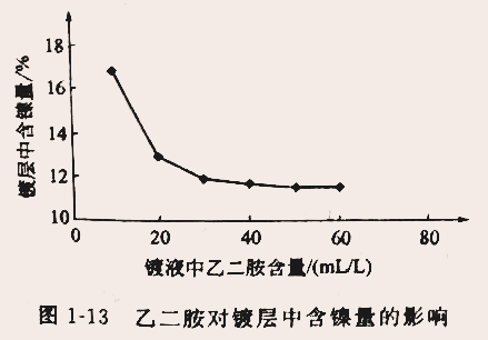 氨水对镍离子和锌离子也有较强的络合作用,形成络合离子[NNi(NH3)6]的稳定常数为K不稳=1.86x10-9;锌离子和氨作用,也可形成四氨合锌铬离子[Zn(NH3)4]2+,其不稳定常数为K不稳=3. 46x10-10。对镀液的稳定性和镀层的成分都有较大影响。但由于氨水的稳定性较差,应注意尽量少用或不用。络合剂还具有提高阴极极化和细化结晶的作用。另外,镀液中的乙二胺络合剂也有着较大的影响,乙二胺和镍离子形成三(乙二胺)合镍离子[Ni(H2NCH2NH2)3]2+,其不稳定常数K不稳=2.57x10-9;乙二胺和锌离子形成三(乙二胺)合锌离子[Zn(H2CH2NH2)2]2+,其不稳定常数K不稳=8.12x10-13。图1-13 是镀液中乙二胺对镀层中含镍量的影响。