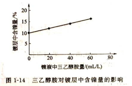 ④三乙醇胺 可与锌离子和镍离子都能形成络合离子,但与锌络合的不稳定常数为K不稳=1.0x10-2,比较大;而与镍络合的不稳定常数为K不稳=8.13x10-4,比较小;这说明三乙醇胺与镍形成络合离子更为稳定,并提高了阴极极化,也有利于镀液维护和改善镀层外观质量。三乙醇胺对镀层中含镍量的影响见图1-14。