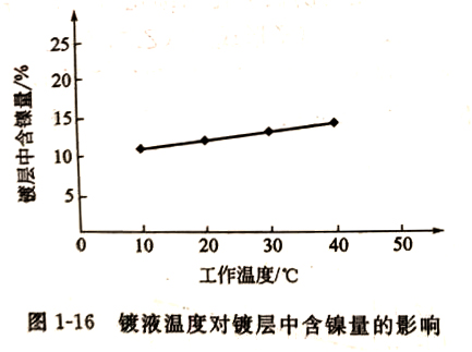 ⑥温度的影响 镀液温度在15~40℃范围内,都能得到良好的镀层外观。一般随镀液温度升高,合金镀层中镍含量有所增加,参看图1-16。