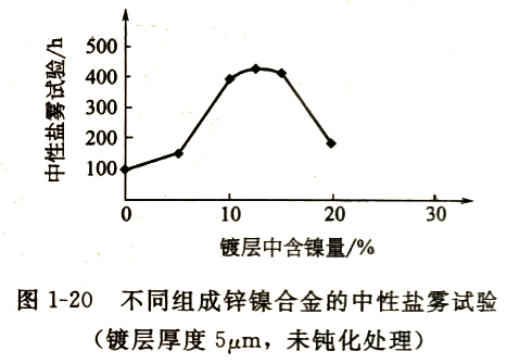 由图1-19和图1-20可以看出,所得两条曲线有着相同的走势和类似的形状,说明用电化学法和中性盐雾试验,测得的耐蚀性结果是一致的。并表明合金中含镍量在9%~17%范围内的镀层,具有优良的耐蚀性,其中以含镍量为13%左右的镀层耐蚀性最佳。