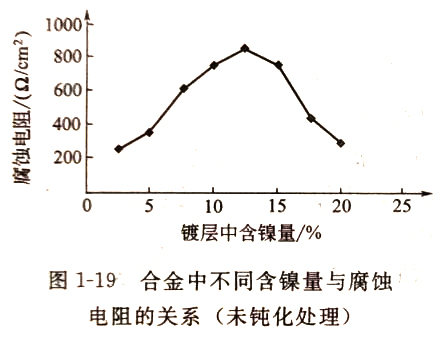 采用DD-Z型电镀参数测试仪,以线性极化法,测合金镀层的腐蚀电阻,在室温28℃的5%NaCl溶液中,分别测定不同含镍量镀层的阳极极化曲线,得到腐蚀电阻与合金中含镍量的关系(见图1-19)。