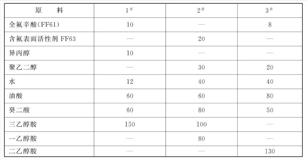 [制备方法]使氟碳表面活性剂在有机醇助溶剂中溶解和缩合反应,缩合反应先使油酸、癸二酸、一乙醇胺和/或二乙醇胺和/或三乙醇胺在80~100°C反应至黏稠透明液体,并使反应物溶于水,然后再加入其他组分缩合反应至透明稠状浓缩物。