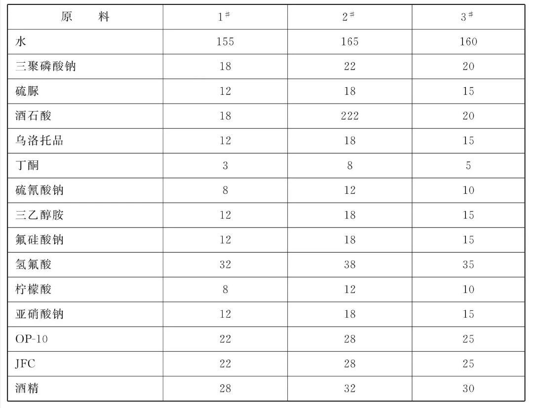 所说B料各组分质量份配比范围为:水155~165、三聚磷酸钠18~22、硫脲12~18、酒石酸18~22、乌洛托品12~18、丁酮3~8、硫氰酸钠8~ 12、三乙醇胺12~18、氟硅酸钠12~18、氢氟酸32~38、柠檬酸8~12、亚硝酸钠12~ 18、OP-1022 ~ 28、JFC22~28、酒精28~ 32。