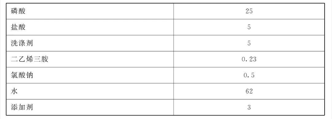 [原料配伍]本品各组分质量份配比范围为:磷酸25~30、盐酸5~10、洗涤剂5~10、二乙烯三胺0.2~0.3、氯酸钠0.5~0.7、水61~65、 添加剂3~5。