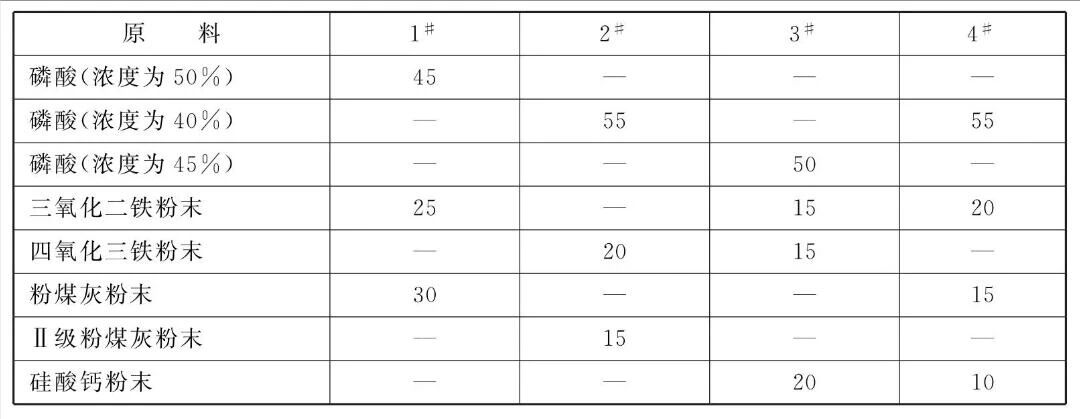 [原料配伍]本品各组分质量份配比范围为:铁的氧化物2030、稀释的磷酸45~ 55、增强材料15~ 30。