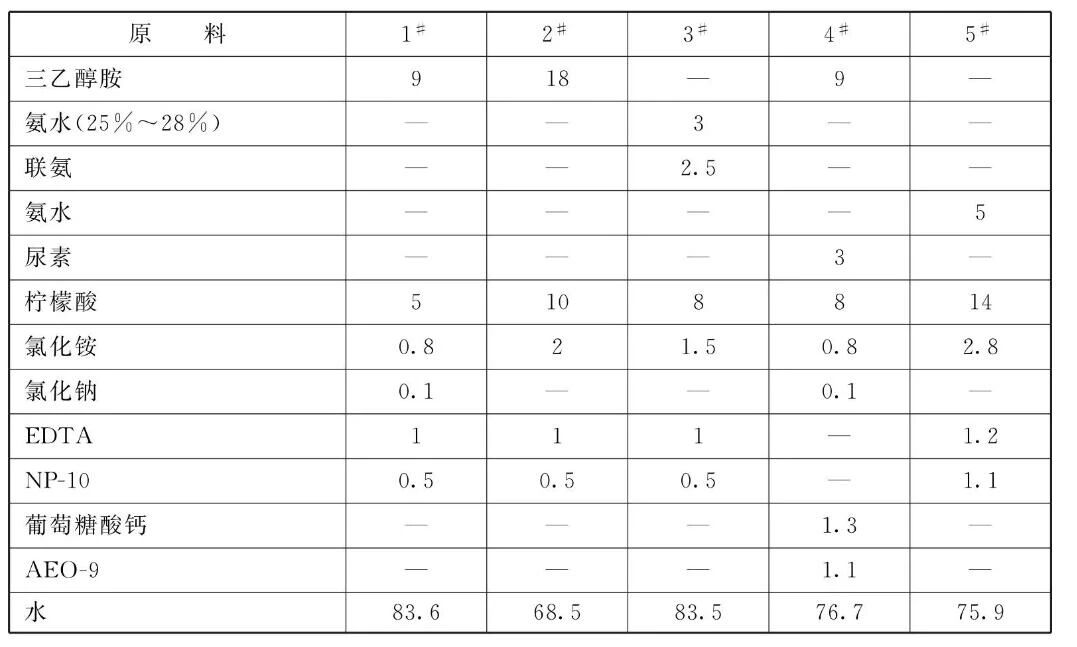 [原料配伍]本品各组分质量份配比范围为:氨或胺10~ 20、有机酸8~15、助剂2~4、表面活性剂0.5~1、螯合剂0.5~1.5、水加至100。