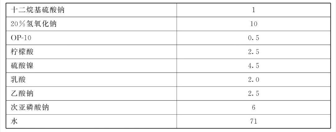 [原料配伍]本品各组分质量份配比范围为:十二烷基硫酸钠0.8~ 1.2、 20%氢氧化钠8~ 12、OP-100.4~0.6、柠檬酸2.2~2.8、硫酸镍4.1 ~4.8、乳酸1.8~ 2.2、乙酸钠2.2~2.8、次亚磷酸钠4~8、水65~ 76。