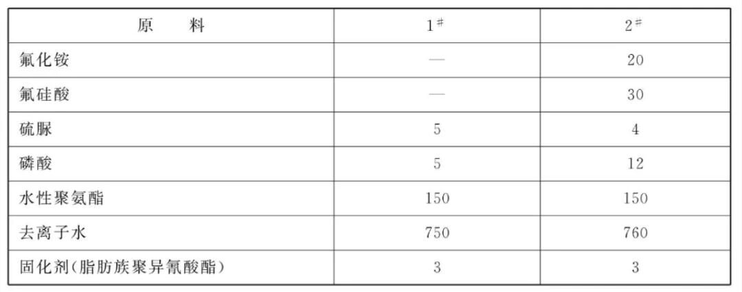 [原料配伍]本品各组分质量份配比范围为:成膜剂140~ 160、无机钝化剂5~6、缓蚀剂4~ 5、稳定剂20~30、pH值调节剂5~12、固化剂2~4、去离子水750~760。
