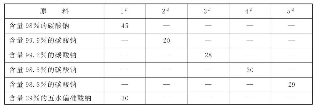 [原料配伍]本品各组分质量份配比范围为:含量98% ~ 99.9%的碳酸钠20~45、含量27% ~ 29%的五水偏硅酸钠30~55、三聚磷酸钠20~35、壬基酚聚氧乙烯醚3~20。