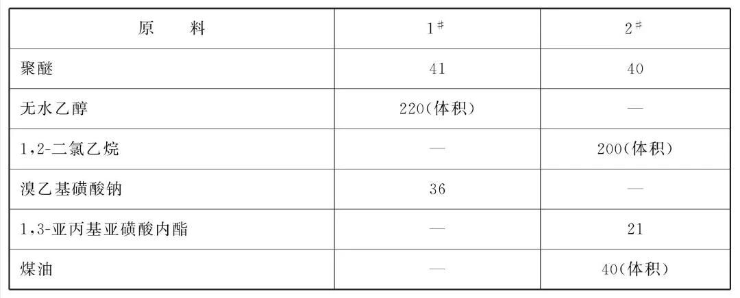 [原料配伍]本品各组分质量份配比范围为:聚醚40~41、溶剂200~220(体积)、溴乙基磺酸钠或1,3-亚丙基亚磺酸内酯21 ~36、煤油40 (体积)。